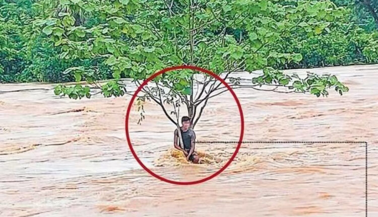 रविवार को शंख नदी के तेज बहाव के बीच पेड़ से लटका युवक (लाल घेरे में)। सूचना मिलते ही ग्रामीणों ने तत्परता दिखाई और काफी मशक्कत के बाद युवक को बचाया। इससे एक बड़ा हादसा टल गया।