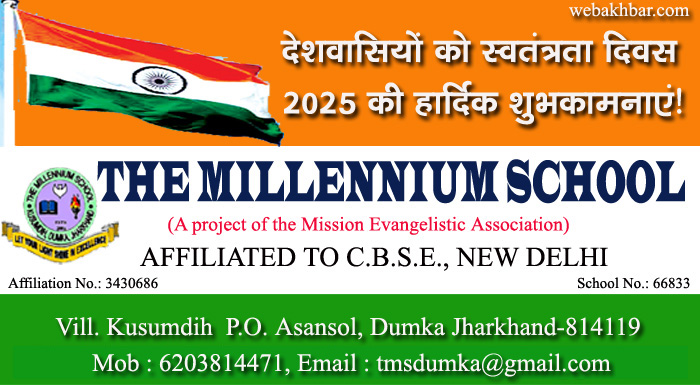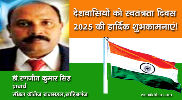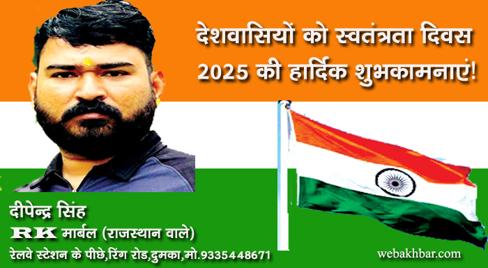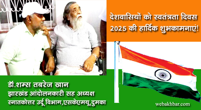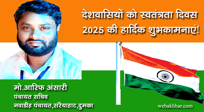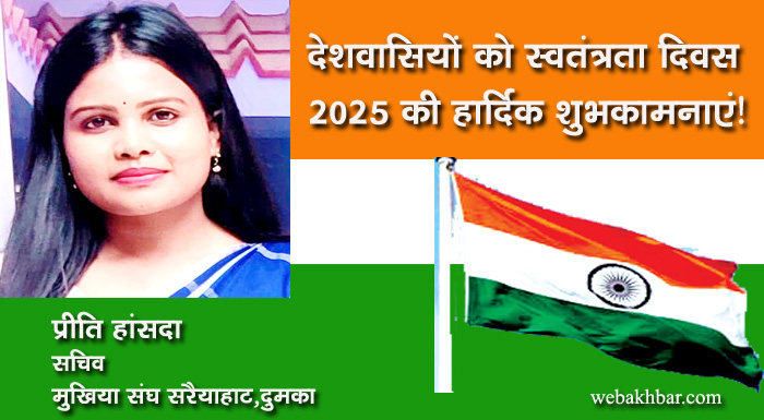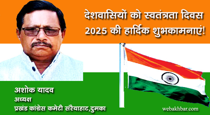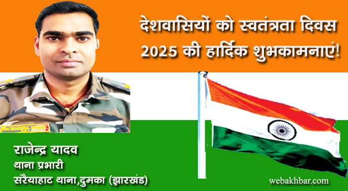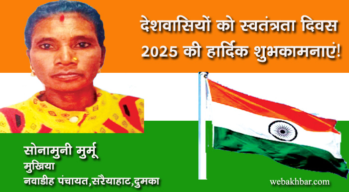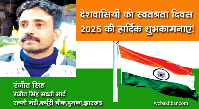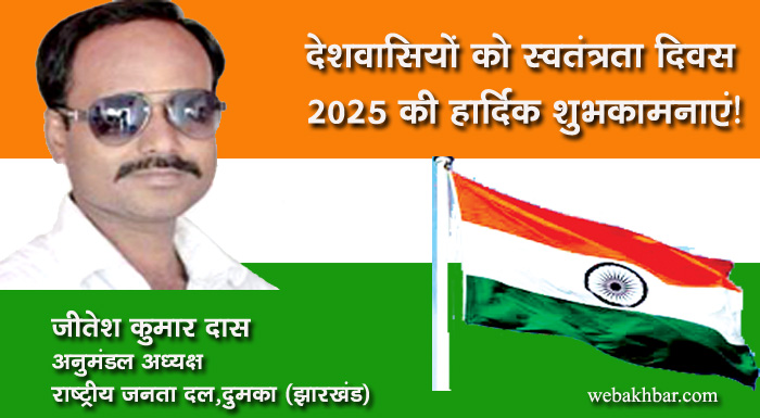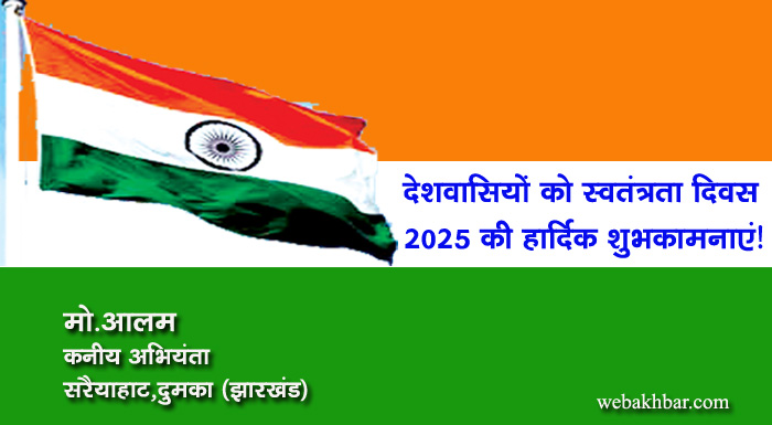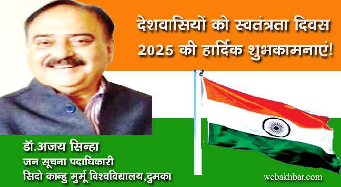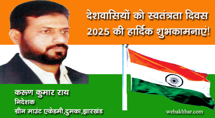 दुमका सहित पूरे देशवासियों को भारतीय स्वतंत्रता दिवस 2025 की हार्दिक शुभकामनाएं! शुभकामना By webakhbar.com Last updated Aug 15, 2025 0 715 Share 🔊 खबर सुनें 0 715 Share
