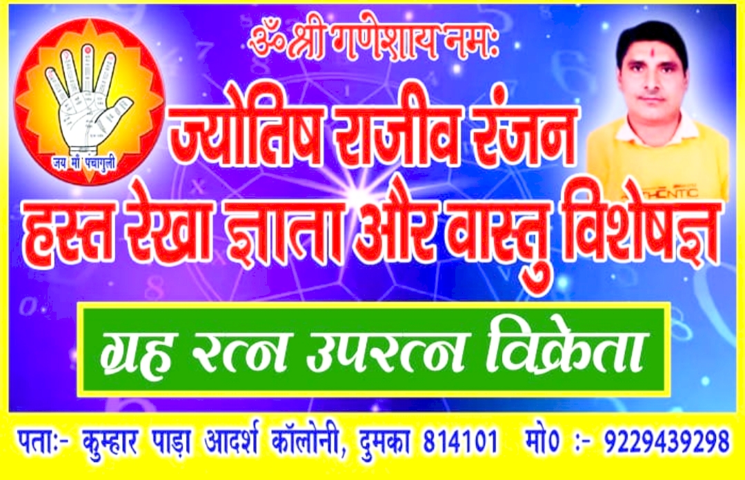 पूर्व नगर परिषद् अध्यक्ष अमिता रक्षित ने यूपीएससी में 41वीं रैंक लाने वाली सुदीपा दत्ता को किया सम्म... दुमका प्रीमियर लीग सीजन 2 की तैयारी शुरू, 8 टीमों के साथ होगा भव्य आयोजन झारखंड की शान बनी दुमका की सुदीपा दत्ता, यूपीएससी में 41वीं रैंक से लहराया सफलता का परचम दुमका : रसिकपुर में सूखा कुआं बना खतरे का कारण, भरवाने की मांग दुमका में बाबा साहेब की प्रतिमा से छेड़छाड़ के विरोध में भीम आर्मी का प्रदर्शन दुमका इस्कॉन में गौर पूर्णिमा महोत्सव : फूलों की होली और हरिनाम की गूंज, सजा वृंदावन सा दिव्य धाम 22 फरवरी को दुमका के शिव सुंदरी रोड में हुई मारपीट घटना का मुख्य अभियुक्त मंटू ओझा गिरफ्तार फेयर प्राइस शॉप डीलर्स एसोसिएशन के प्रदेश अध्यक्ष ओंकार नाथ झा का निधन, पीडीएस जगत में शोक की लहर वृद्धाश्रम में खिला खुशियों का गुलाल, रोटी बैंक दुमका ने होली पर बांटा अपनापन और सम्मान होली मिलन समारोह में नवनिर्वाचित नप अध्यक्ष अभिषेक चौरसिया ने दिया सौहार्द, सहयोग और विकास का संदेश