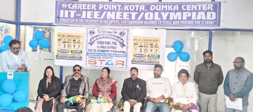 काॅमर्स के सचिव मनोज कुमार घोष, नगर परिषद् दुमका की पूर्व अध्यक्ष अमिता रक्षित, एलआईसी के वरिष्ठ विकास अधिकारी डॉ.पीके बरनवाल, एकलव्य विद्यालय काठीजोरिया की प्राचार्या लेफ्टिनेंट सुमिता सिंह और मारवाड़ी युवा मंच के अध्यक्ष राजेश अग्रवाल ने उक्त परीक्षा में सफल छात्रों को पदक और प्रमाण पत्र प्रदान कर सम्मानित किया। अपने संबोधन में मुख्य अतिथि श्री घोष ने स्थानीय अभिभावकों से अपील की कि वे अपने बच्चों को नीट व जेइइ की परीक्षा की तैयारी के लिए बाहर न भेजे, क्योंकि करियर पाॅइंट दुमका इसका सबसे अच्छा विकल्प है। अपने संबोधन में नगर परिषद् की पूर्व अध्यक्ष श्रीमति रक्षित और लेफ्टिनेंट सुमिता सिंह ने भी करियर पॉइंट दुमका की सफलता की सराहना की। कार्यक्रम में संस्थान के निदेशक इंजीनियर राकेश रोशन ने बताया कि करियर पॉइंट, दुमका पिछले 3 वर्षों से यहां नीट और जेइइ परीक्षाओं की तैयारी करा रहा है। इस वर्ष संस्थान के 4 छात्रों ने नीट और 5 छात्रों ने जेइइ मेन्स की परीक्षा उत्तीर्ण की है, जिससे इस संस्थान की सफलता दर 70 प्रतिशत बढ़ गई है।